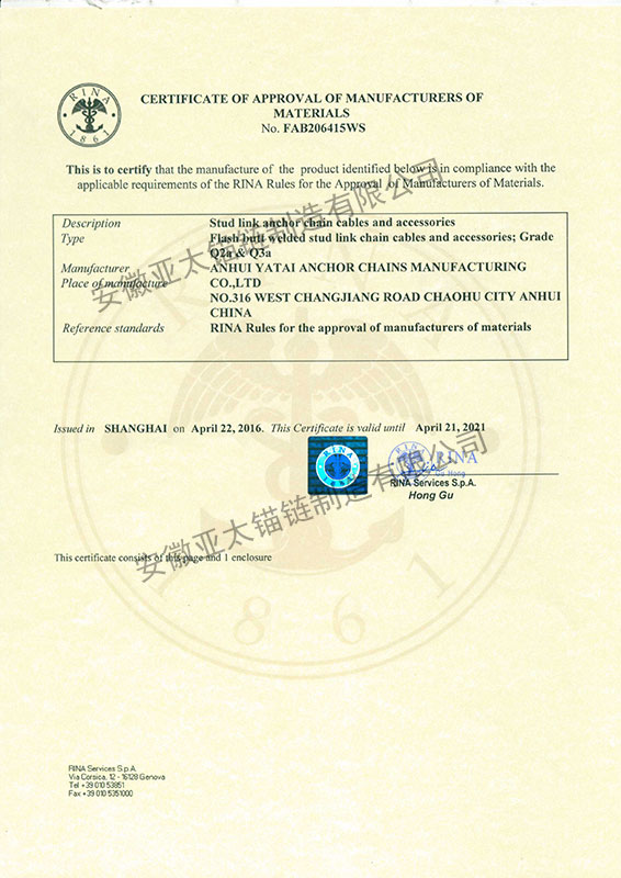 安徽亞太錨鏈制造有限公司是國家高新技術企業,也是國家GB/T 549-2017《電焊錨鏈》標準的起草和制定單位之一。公司旗下設有錨鏈分廠、浮標分廠、舾裝件分廠等多個分廠。公司專業從事φ12.5mm-φ107mm二、三級船用錨鏈、浮標錨鏈、錨鏈附件,錨、船舶曬裝產品、航標、系船浮、船型標、多種規格海洋監測浮標及航標燈等產品的生產、安裝和服務。目前公司的產品銷往全國各地船廠、碼頭、航標處、航道局、海洋局,并已走上國際市場,如東南亞、中東、歐美等國家。